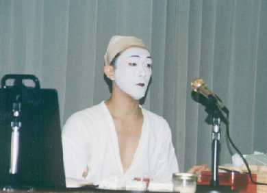 お化粧の実演に移る。 人前で化粧をすることは、大変緊張する。楽屋うちや制作過程は見ない方が良い。化粧台前はきちんと整えて、身内にもさわられるのを嫌がる。自分だけの世界である。 水化粧が基本である。 @ 女形は眉を剃る。びん付けで眉を殺す。しっかり眉を張りつける。 A 下地クリームをていねいに塗る。今日は顔だけだが、首や襟足に念入りに塗る 。 (これで5割がた終わったようなもの、とのこと。 下地クリームがいかに大切かを痛感する。) B 眉のびん付けをとる。 C 帽子をかぶる(手作りとか)。 D 羽二重の布で頭を締める(眼をつりあげる)。 E 眉つぶし(ドーランの肌色で)。 F 頬紅をほんのりとつける(位置が下に来ないように)。 G おしろいを塗る。(これには鉛が入っている。ボタン刷毛で2〜3回塗っていく。 顔より襟を白く塗る。これが大変難しい。 下地がきちんとついていないとむらになる。これが出来て一人前。)
