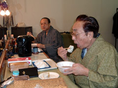 前進座は1月3日から1月23日まで京都南座で、同じ演目での正月興行を済ませた後、そのまま24日に鳴門に入り、24、25日は公演に備えて舞台設営また稽古になっていました。3日間も鳴門で宿泊されるので、鳴門市民劇場としても座員の方々に25日のお昼くらいは「お通し」を出すことになりました。私自身は、新米でもあり「お通し」の意味も分からなかったのですが、差し入れの言い換えのようです。