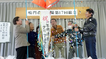 鳴門市民劇場が設立以来、初めて昨年3月から今年1月まで(1月例会クリアは、2007年以降7年ぶり)6例会連続クリアを達成しました。これは1年間全サークルが力を合わせてできたことです。この快挙をみんなで祝うとともに、前例会会員数クリアを今後につなげるために、“紅白のもちをつき、総会・代表者会で配ろう!”また、この歓びをみんなで味わうために“くす玉割の行事もしよう!”と話合いました。