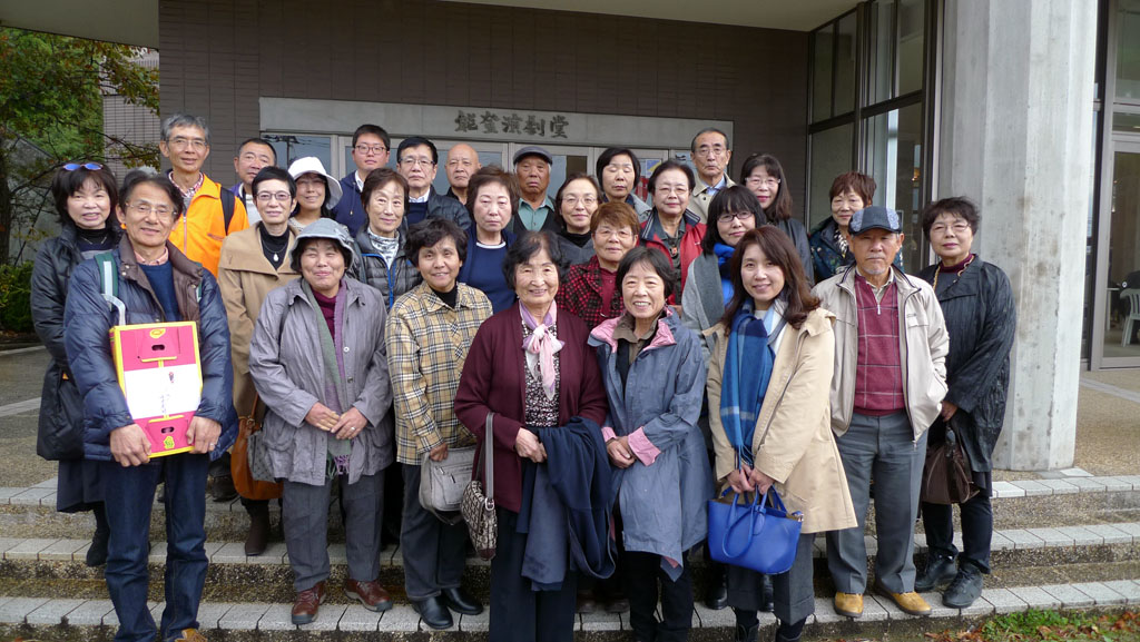 先斗町歌舞練場で集合写真 その後は、それぞれ自由に先斗町界隈を散策。断続的に降る雪の京都も乙なもの。後で聞くと、高瀬川沿いの「日本映画発祥の地」の旧立誠小学校跡の建物内で美味しいコーヒーを味わった人や手作り数珠の店を覗いた人など、各自さまざまに新春の京都の町を楽しんだようです。帰りの車中では、「チャップリン」サークルの藤田担当の、今回のツアーに関連するゲームやクイズがありました。景品も出たり、ちょっぴり豆知識も得たりして、賑やかな時間を過ごしました。「なかもず」サークルの姜さんが1月例会の紹介とクリアへの熱い思いを語りました。その後、各自一言感想を述べ、井上さんがまとめの挨拶をしました。雪も止んで、運転手さんの安全運転のお陰で、予定より早く18時30分に全員無事帰着。楽しく充実した一日を過ごしました。